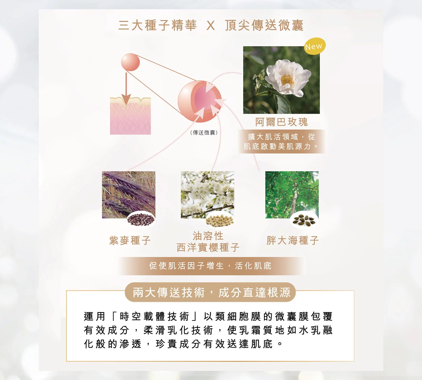 運用時空載體技術將三大肌活種子精華:西洋櫻花種子精華、胖大海種子精華、紫麥種子精華深入肌膚底層。三大種子力量,幹細增生效果再進化。